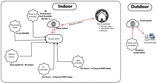 The system workflow for smart control and monitoring is shown in Figure 1. An electricity meter (Acrel ADL200, Jiansu Acrel Electrical Manufacturing Co., Ltd., Jiangyin, China) was installed to provide the real-time monitoring of the room’s total electricity consumption, with data transmitted to a central processing unit for analysis. For environmental monitoring, a Xiaomi LYWSD03MMC sensor, manufactured by Xiaomi in Beijing, China, measured indoor temperature and humidity, while another temperature and humidity sensor (Sensirion model SHT31, Sensirion AG, Stäfa, Switzerland) recorded outdoor conditions. These sensors provided continuous feedback to the control system, ensuring that the indoor environment remained within the ASHRAE comfort range of 20–27 °C and 40–65% relative humidity. Occupancy detection was managed by a Xiao-ESP32-C3 microcontroller (manufactured by Seeed Studio in Shenzhen, China) equipped with an infrared motion sensor positioned to detect movement within the room. This allowed the system to dynamically adjust energy consumption based on real-time occupancy status, such as activating the air conditioning system only when motion was detected (e.g., activating cooling systems when motion was detected). The air conditioning system was controlled via a Grove 2-Channel SPDT Relay (manufactured by Seeed Studio in Shenzhen, China), enabling automated switching based on sensor input. The relay received commands from the central control logic to maintain the desired temperature and humidity. Lighting was similarly managed through a Grove 4-Channel SPDT Relay (manufactured by Seeed Studio in Shenzhen, China), allowing for the remote and automated control of the room’s lights. All devices communicated through a network access point (Wi-Fi router repeater, TP-LINK model Archer C54, manufactured by TP-Link Technologies Co., Ltd. In Shenzhen, Guangdong, China), ensuring reliable data transfer between sensors, controllers, and the cloud system. Home Assistant software (version 2025.4.1, an open-source sponsored by Nabu Casa in Irvine, CA, USA), which is integrated with the system, is responsible for monitoring, controlling, and automating the devices. It allows users to set rules, download data, and remotely monitor the system’s performance via an IoT platform. The IoT cloud was integrated to enable remote access to the system for monitoring and control. Users can use the cloud to adjust settings such as temperature thresholds, motion detection rules, and electricity usage limits. All devices continuously send real-time data (e.g., electricity usage, temperature, humidity, and motion detection) to the Home Assistant via the access point.