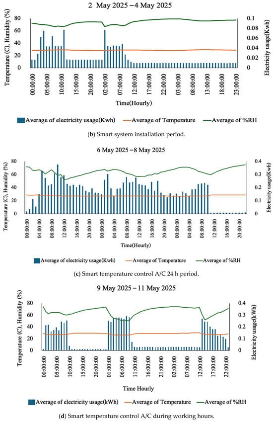 The electricity usage data reveals significant insights into the impact of smart systems [27,28] and air conditioning control on energy consumption [27]. The period during which the smart system was being set up (2 to 4 May 2025) saw a modest increase in power consumption compared to the background period (22 to 26 April 2025). The functioning of the smart system or additional devices added as part of the configuration may also be responsible for this rise. Compared to the background period, the temperature and humidity were more effectively managed, which suggests that the system had a role in regulating environmental parameters. As a result of the air conditioning being adjusted to maintain a temperature below 27 degrees Celsius continuously for twenty-four hours (from 6 to 8 May 2025), the amount of power consumed increased to an average of 0.168 kWh per hour. Due to this significant rise, the energy-intensive nature of continuous air conditioning is highlighted, resulting in a substantially larger power demand [28,29] compared to non-smart system control times for A/C. The system efficiently maintained a pleasant temperature and humidity level within acceptable ranges, despite consuming a significant amount of energy. The power usage was considerably lower (0.099 kWh) during the working hour-only A/C control period (9–11 May 2025).