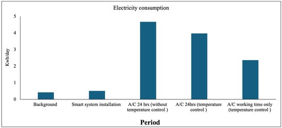 The ANOVA test confirms significant differences in electricity usage across the five testing periods. Specifically, the A/C control periods (two conditions for A/C 24 h and one condition for working hours) resulted in substantially higher energy consumption than that in the background and smart system periods, as there was no activity during the experiment launch.