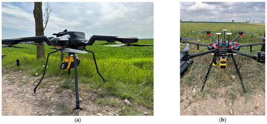 The Mapper+ dataset used a YellowScan Mapper+ sensor mounted on a DJI Matrice 600 (M600) UAV platform (SZ DJI Technology Co. Ltd., Shenzhen, China), while the Voyager datasets were equipped with the YellowScan Voyager sensor (YellowScan, Saint-Clement-de-Reviere, France), mounted on an Acecore NOA UAV platform (Acecore Technologies, Uden, The Netherlands ). Photos of both UAV-LiDAR setups used during data acquisition are shown in Figure 2, illustrating the sensor–platform combinations deployed under real field conditions.