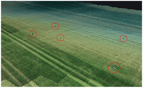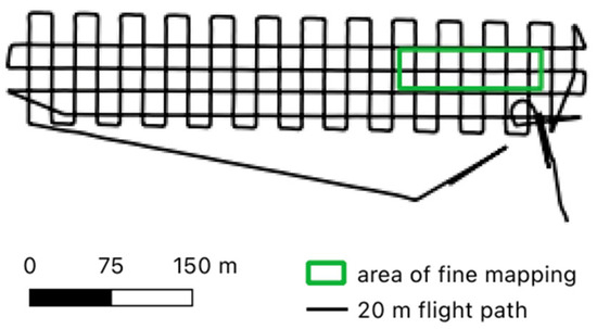 Each flight followed a cross-flight (lawnmower) pattern with parallel flight lines and systematic turns at the end of each pass to ensure comprehensive and evenly distributed coverage. This configuration minimized scan shadows and ensured a high point density across the field. The flight speed was kept consistent at 4 m/s across all altitudes. The overall survey setup, including start and end points, the orientation of flight lines, and extent of the study area, is illustrated in Figure 3. All point clouds were recorded in LAS 1.4 format and georeferenced using post-processed kinematic (PPK) corrections from a Trimble R10 base station, operating in the ETRS89/UTM Zone 32N coordinate system. No initial ground filtering or classification was applied to preserve all surface features relevant for burrow entrance detection.