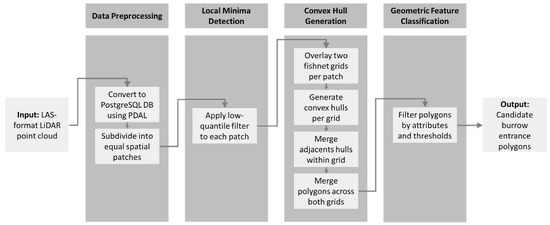 A workflow of the burrow entrance detection algorithm, showing all core processing steps from LAS import to polygon classification.