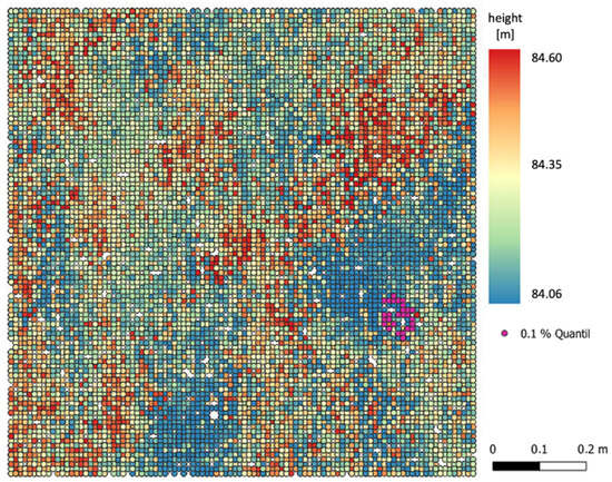 In order to detect local depth minima, statistically significant surface depressions within the point cloud were identified by applying a quantile-based threshold to the elevation values of each spatial unit. The approach is conceptually adapted from methods for identifying local maxima in canopy height models, particularly those used to delineate individual tree crowns [19], but is here inverted to detect negative relief features such as burrow entrances.