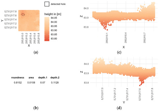 Example of a filtered candidate burrow polygon showing (a) a convex hull within a 1 × 1 m patch, (b) the attribute summary of a hamster burrow, (c) the vertical profile along the x-axis, and (d) the vertical profile along the y-axis.