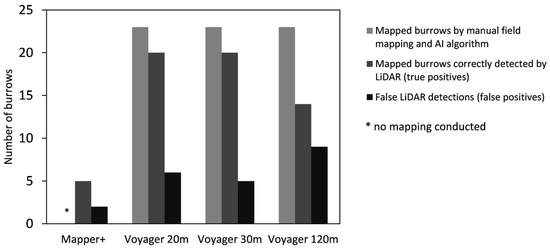The detection algorithm’s performance varied significantly across the tested Li-DAR datasets (Voyager 20 m, 30 m, and 120 m), largely reflecting differences in spatial resolution and temporal alignment with reference data. Figure 10 summarizes the number of mapped reference locations, and the number of true- and false-positive detections. Across all datasets, the 30 m Voyager flight produced the best results, detecting 20 out of 23 reference burrow entrances with 5 unmatched detections. The 20 m dataset yielded identical detection accuracy but produced six false positives. In contrast, the 120 m dataset demonstrated substantially reduced performance, detecting 14 of 23 burrow entrances and yielding 9 false positives. In the Mapper+ dataset (collected in 2022), a total of seven detected depressions were found, of which five were identified as likely burrow entrances through visual inspection, while two were categorized as false positives.