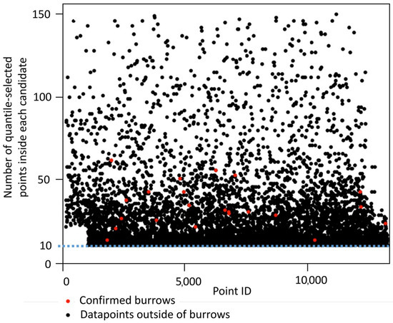 Among the five filter criteria, the nPoints attribute—representing the number of quantile-selected points inside each candidate—proved particularly valuable for distinguishing true burrow entrances from noise. As shown in Figure 11, almost all reference-confirmed burrows are associated with polygons exceeding 10 points, while polygons with lower values rarely matched known locations. This justified the adoption of a minimum nPoints threshold of 10 in the final filter logic.