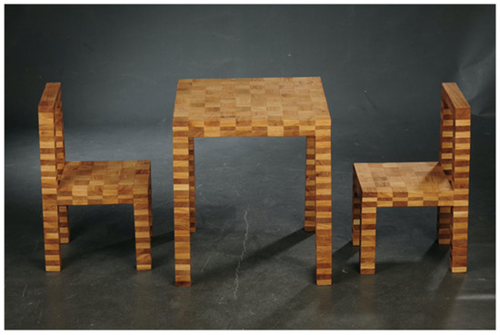 Of primary importance is the sustainability level in materials development. Transforming waste into new, high-value products is an innovative material solution that can help achieve production sustainability in business [23]. As waste materials possess variable characteristics (e.g., size), one of the key tasks when upcycling materials is adjustment. Solid wood from a sawmill has large dimensions, allowing it to be processed into semi-finished products that can be used to manufacture numerous other goods. Due to the various nonstandard dimensions and the presence of waste and residues, wood waste is less versatile. Attempts can be made to glue small off-cuts together to produce a larger semi-finished product; this customisation is one principle underlying smart design [24].