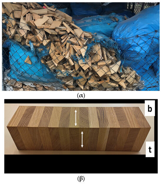 Test samples were made from flooring material post-production waste (Figure 3α) of the highest wood quality class A, following the EN 1927-2:2008 standard [38]. The samples were made of oak wood (Quercus L.) with an average density of 720 ± 40 kg/m3. The samples were stored for a period of one to three months in a roofed room. Therefore, during collection they had air-dry humidity, i.e., from 12 to 15%. The samples comprised rectangular cuboid shapes of 20 mm thickness. Due to the production characteristics of flooring materials made from solid wood, the elements had to be glued together with broad surfaces in a cross pattern (plywood-like) to obtain beams (Figure 3β). In the drawing, the fiber directions in adjacent layers are marked with arrows.