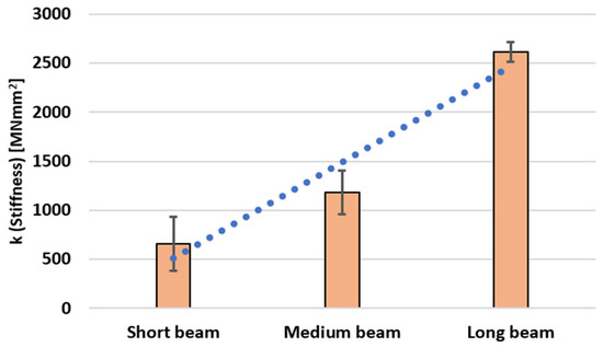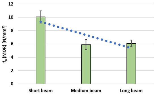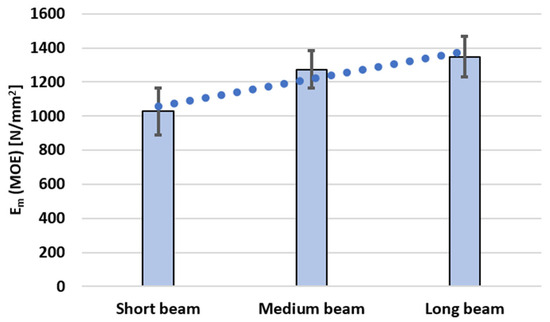 The MOE measurements for individual samples are presented in Table 1, together with the mean values for the short, medium, and long beams, which are plotted in Figure 4.
