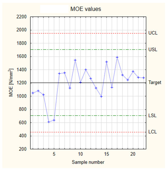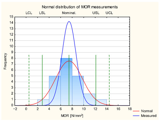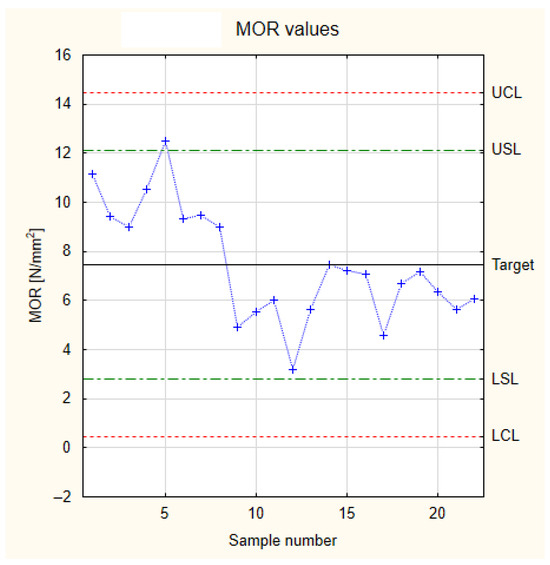 The kurtosis analysis for the MOR values in Figure 8 yielded a negative value of −0.32. This negative but relatively small value could be consistent with either a mesokurtic or platykurtic distribution. The mass of the distribution is spread out; the values are scattered around the mean, and there is a lower probability of extreme values. In practice, this means there is also a lower probability of obtaining values close to the nominal value. A detailed analysis of the MOR measurement results is presented in Figure 9 using a Shewhart control chart.