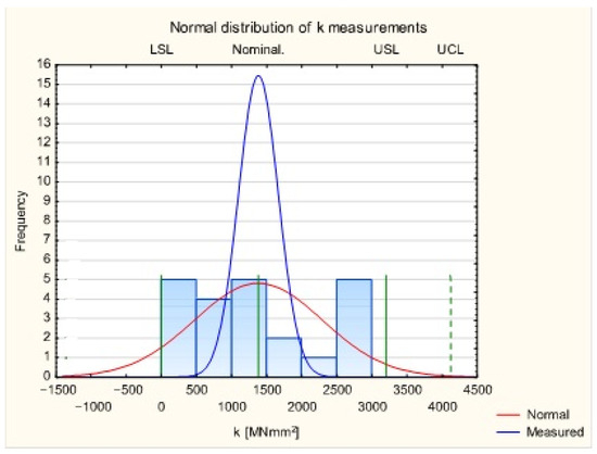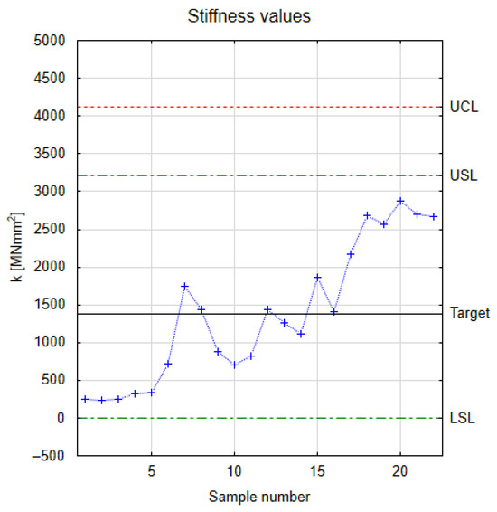 The kurtosis analysis for the stiffness values in Figure 11 yielded a negative value of −1.25. This indicates a platykurtic distribution for the obtained stiffness values. The mass of the distribution is spread out. A negative kurtosis value indicates a lower intensity of extreme values and a visually flat distribution. The obtained negative excess indicates that the tails of the stiffness value distribution are narrower than those of the normal distribution. A detailed analysis of the stiffness results is presented in Figure 12 using a Shewhart control chart.