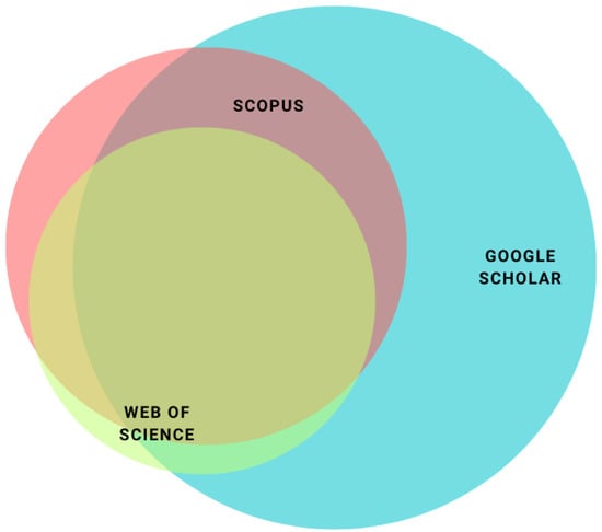 This review used an SLR methodology based on four stages: definition of research questions, search process, studio selection, and quality assessment [31,32,33]. The first step to establishing the research questions was to define the objectives and scope of data selection and synthesis. After this, the next step was to search for articles in prestigious databases. Scopus was selected because of its recognized prestige and extensive indexing of high-quality scientific publications. In addition, it includes articles from other reputable databases and publishers, such as Web of Science (WoS), IEEE Xplore, and Springer. This overlap is illustrated in the Martin’s Web application [34], which presents a Venn diagram demonstrating the intersections of citations between various databases for specific topics and subtopics. Figure 2 illustrates the overlap between Google Scholar, Scopus, and Web of Science in the fields of “Engineering & Computer Science”, “Automation & Control Theory”, “Artificial Intelligence”, and “Sustainable Energy”.
