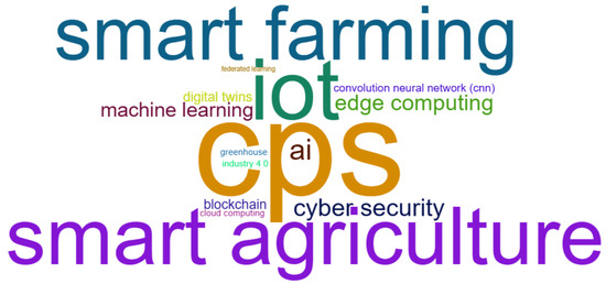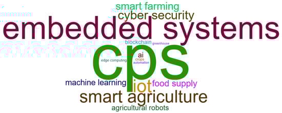 Figure 4 shows the word cloud of keywords. In this graph, the most frequent word is CPS, as expected. Other frequent terms include smart agriculture, intelligent farming, IoT, and embedded systems. These terms are closely related to CPS, and in certain case studies, they can refer to the same or very similar concepts. In addition, trending techniques such as AI and ML are highlighted. These techniques, which have been research fields for the past few years, have been used in recent studies to improve the implementation and performance of CPS [36,37].