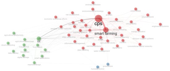 The red node represents the network with the strongest correlations to CPS, it is unsurprising that “smart farming” emerges as the most prominent topic. Furthermore, themes such as “virtual reality”, “physical world”, “decision making”, “real-time systems”, “cyber security”, “security systems”, “risk detection”, and “anomaly detection” are evident and exhibit strong correlations. These relationships are discussed in more detail in Section 2.