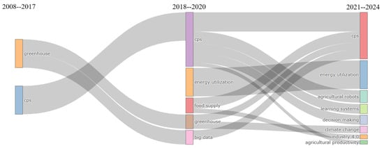 In the final period, 2021–2024, “CPS” remains a central term. Still, the scope of research has expanded to include terms such as “agricultural robots”, “learning systems”, “decision-making”, and “agricultural productivity. These terms represent specific tools for applying a “CPS” in agriculture. Furthermore, terms such as “food supply”, “greenhouse”, and “big data” have become increasingly associated with CPS. In particular, the term “greenhouse” is now related to Industry 4.0, while “energy utilization” continues to show consistency with trends from the previous period.