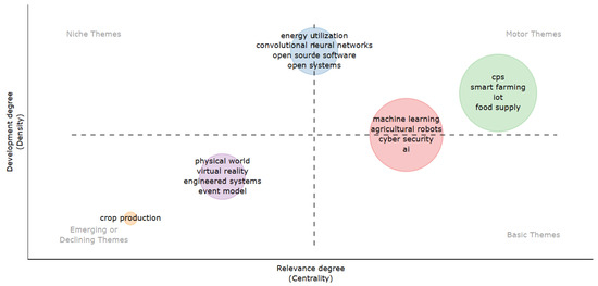 Quadrant 1 (Motor Themes): This quadrant includes four keywords, “CPS”, “smart agriculture”, “IoT”, and “food supply”, which demonstrate the highest relevance and significant development in research, with “CPS” being the most prominent. Additionally, this quadrant partially includes keywords like “energy utilization”, “convolutional neural networks”, “open source software”, “open systems”, “machine learning”, “agricultural robots”, “AI”, and “cyber security”.