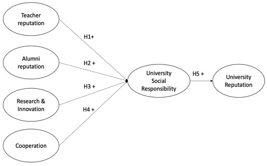 Based on the hypotheses and theories proposed by prior researchers [17,18,19,20,21], we identified the main factors that influence university social responsibility: teacher reputation, alumni reputation, research and innovation, and internal/external cooperation. For university stakeholders, the activities and outcomes of teaching and research are seen as the services and responsibilities the university provides to society. For instance, the professional contributions of teachers and alumni play a vital role in shaping society, organizations, individuals, and governments. Therefore, it is reasonable to assume that reputable teachers and alumni enhance a university’s overall social responsibility. Furthermore, internal and external cooperation, along with innovative initiatives, are viewed as key factors of a university’s responsibility to society. By engaging in partnerships with industry, government, other academic institutions, and the broader public, universities can play an active role in addressing social and economic challenges. Based on this theoretical perspective, we present the following hypothetical model for our study (Figure 1).