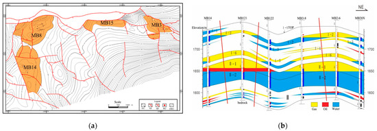 Horizontal and vertical distribution of M gas reservoir: (a) top view of the structural map of the M gas reservoir, and (b) the vertical view of fluid distribution. The three red lines represent faults.