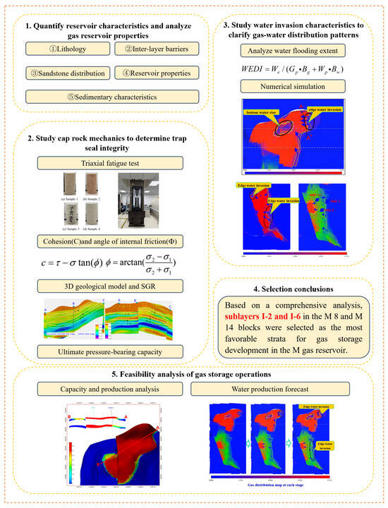 Selecting favorable layers for UGS construction in a multi-layered water-bearing gas reservoir could be a challenging task [42,43]. There are still problems such as incomplete analysis of the sealing capacity of trap structures, unclear understanding of fluid migration patterns, and a lack of systematic research on water invasion characteristics [44,45], which led to the failure of the comprehensive assessment of potential UGS construction areas. In response to the above problems, this study proposed a comprehensive framework for the assessment and selection of the construction of vertical layers of UGS in a multi-layered water-bearing gas reservoir. This framework first integrates dynamic testing of geomechanical parameters with quantitative characterization of water invasion, resolving the vertical sealing–water invasion coupled evaluation challenge in multi-layered gas reservoirs. Firstly, according to the geological characteristics, the sedimentary characteristics, sand distribution, inter-layer, lithology, and physical property characteristics of the reservoir were assessed, respectively. The reservoir’s storage characteristics and development potential were quantitatively assessed. Secondly, based on rock mechanical properties, the static sealing capacity of the caprock, the static sealing capacity of faults, and the dynamic sealing capacity of traps were quantitatively evaluated, respectively. Then, numerical simulations were carried out to study the distribution and migration of subsurface fluid, resulting in a detailed and quantitative depiction of water encroachment dynamics. Finally, by integrating results of geomechanical and hydraulic analysis, the favorable layers for UGS construction are selected. Employing the proposed framework, the suitable layers were evaluated and selected for a UGS construction in a multi-layered water-bearing gas reservoir located in northwestern China. The results demonstrated the effectiveness and reliability of the proposed approach. The results of this work served as the fundamentals for the subsequent design of UGS operations. The lessons gained provide insights for the construction of other UGS with similar backgrounds.
