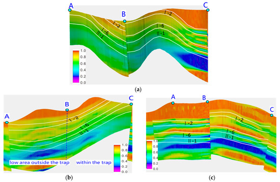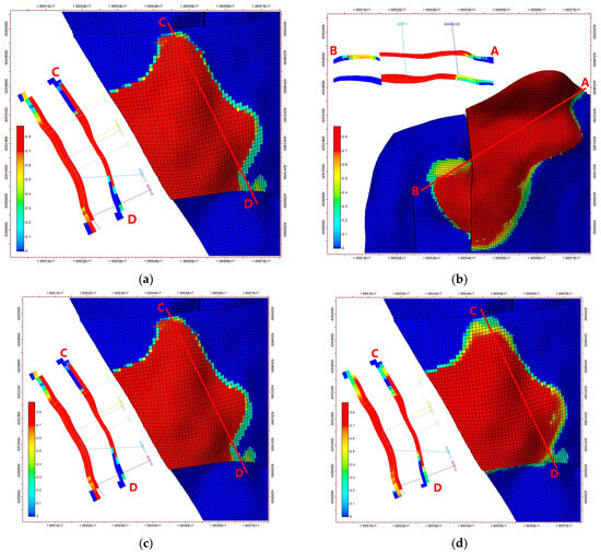 Secondly, the lithologic contact relationship between the two blocks and the distribution of Shale Gouge Ratio (SGR) [48] were employed to assess the static geological sealing capacity of faults within the storage area. SGR is a parameter used to predict the proportion of shale incorporated into the fault zone as a result of mechanical faulting processes, providing insight into the sealing potential of the fault.