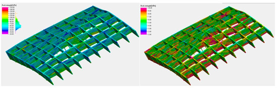 The 3D geomechanical model incorporating rock mechanical parameters. The (left) figure shows the compressive strength, and the (right) one shows tensile strength.