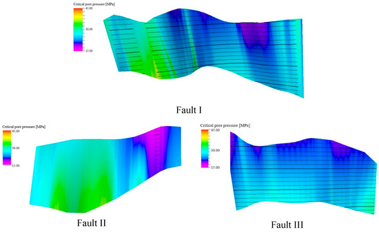 The results demonstrated that after multiple injection–production cycles, the safe pressure-bearing capacities of Fault I, Fault II, and Fault III were determined to be 16.6 MPa, 14.6 MPa, and 17.3 MPa, respectively. The safe pressure-bearing capacity of the internal faults spanned from 18.9 to 22.9 MPa (Table 6). In summary, the minimum safe pressure-bearing capacity across all faults was established at 14.6 MPa.