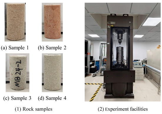 A triaxial compression testing system (MTS-815, Rock Mechanics Test System, USA) was employed to conduct the experiments. The experimental temperature was maintained between 20.3 and 21.5 °C. The samples were retrieved from Well MB and were natural, intact rock cores without structural planes or weathering (Figure 7).