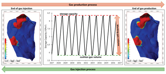 Since the conclusion of the Paris Agreement, it has become the consensus of most countries and regions to actively deal with global climate issues [1]. In response to global climate change, countries have set goals for carbon peaking and carbon neutrality, aiming to reach a global peak in greenhouse gas emissions [2,3]. At present, UGS is one of the mainstream technologies for energy storage, which can significantly improve energy efficiency and supply stability [4]. In addition to the conventional use of natural gas as a cushion gas, the existing studies also include relevant research on using nitrogen and CO2 as a cushion gas [5]. Natural gas is a kind of clean energy; increasing its proportion in the energy consumption can reduce the emission of greenhouse gases, particularly carbon dioxide [6,7,8].