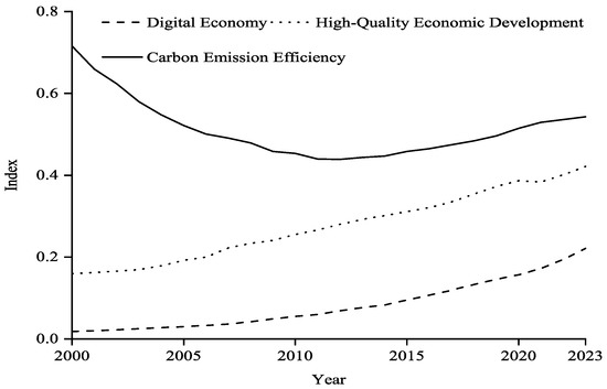 As shown in Figure 1, from 2000 to 2023, the levels of the digital economy and high-quality economic development in China’s 30 provinces show a gradual upward trend. The level of high-quality economic development is higher than that of the digital economy over this period. Specifically, the level of the digital economy increased from 0.018 in 2000 to 0.221 in 2023, while the level of high-quality economic development rose from 0.160 in 2000 to 0.421 in 2023. Carbon emissions efficiency showed a downward trend from 2000 to 2012 and an upward trend from 2012 to 2023. The possible explanation for this pattern is that in the early stage of economic development, the level of technology was low, and the industrial structure tended towards heavy industry with high energy consumption, high pollution, and high emissions, with relatively high carbon emissions per unit of output, and thus low carbon emissions efficiency. However, with sustained economic growth, continuous technological progress, and upgrades to China’s industrial structure, the economy shifted from heavy industry and manufacturing toward service and high-tech industries, which are less carbon intensive. At the same time, energy efficiency has been continuously improving, clean and renewable energies have come into widespread use, and carbon emissions intensity has gradually decreased [72]. In addition, the Chinese government has also intensified environmental protection efforts, introducing numerous policies and regulations aimed at reducing emissions and fostering green development. Notable examples include the 12th Five-Year Plan for Energy Conservation and Emission Reduction issued by the State Council in 2012 and the Air Pollution Prevention and Control Action Plan launched in 2013. According to the Environmental Kuznets Curve, pollution levels rise during early industrialization but decline as per capita GDP continues to grow in the post-industrial stage [73]. The observed trend of carbon emissions efficiency—initially decreasing and later improving—aligns with this economic principle.
