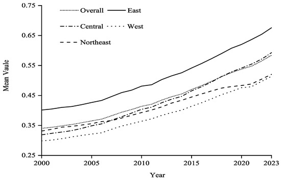 From a regional perspective, all four major regions in China show an upward trend in the degree of coupling coordination over the period studied. The Eastern region, benefiting from its location-driven advantages, has developed a relatively well-established digital economy-based industrial chain that has injected new momentum into high-quality economic development. By actively responding to the national priorities of innovation-driven and green development, the Eastern region has achieved the highest level of coupling coordination. The Western region has a relatively narrow industrial structure, lags infrastructure development, and has limited resources and energy supplies [74]. As a result, it relies heavily on traditional energy industries, leading to the lowest level of coupling coordination. From 2000 to 2006, the Northeastern region had a higher degree of coupling coordination than the Central region; however, from 2007 to 2023 the Central region surpassed the Northeast in this regard. In the early stages of the study period, the Northeast, with its traditional industrial base, had a relatively well-developed industrial system and infrastructure. That created favorable conditions for the digital economy to develop, resulting in a higher degree of coupling coordination than the Central region. However, the growth of heavy industries in the Northeast led to a decline in carbon emissions efficiency. Meanwhile, the steady advancement of the Central China Rising Strategy contributed to the Central region’s improved performance, causing its coupling coordination degree to exceed that of the Northeast.