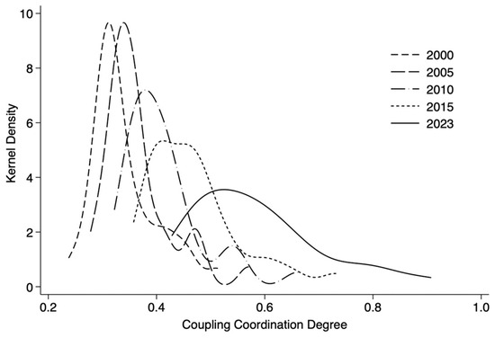 Kernel density estimation of the coupling coordination degree in China.