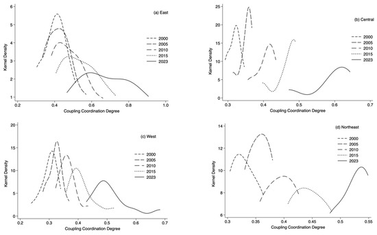 Kernel density estimation of coupling coordination degree in the four major regions.