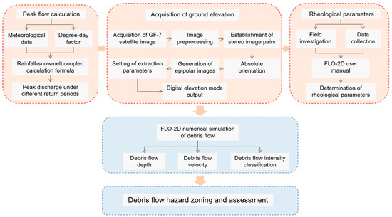 In this study, a rainfall–meltwater coupled debris flow hazard assessment system based on a high-precision DEM and FLO-2D model was constructed using the Laqi Gully of the China–Pakistan Highway as a typical case, and the main conclusions are as follows: