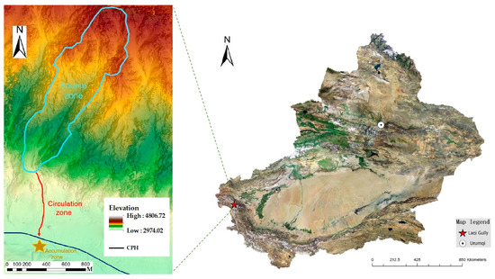 Laqi Gully (38°44′50″–38°46’14″ N, 75°8′35″–75°9’19″ E), is a typical rainfall–meltwater coupled debris flow gully. It is located on the Pamir Plateau in the westernmost part of China, on the north side of the China–Pakistan Highway and Gaizi River, belonging to the Kizilsu Kyrgyz Autonomous Prefecture of the Xinjiang Uygur Autonomous Region (XUAR), and is about 1130 km away from Urumqi, the capital of the XUAR (Figure 2). The watershed of Laqi Gully covers an area of 1.53 km2, the length of the main gully is 2.02 km, the altitude ranges between 5600 and 2900 m, the overall drop of the watershed is 2.09 km, and the average slope of the gully is 37.44°.