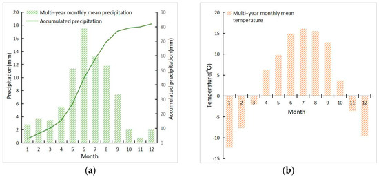 Laqi Gully multi-year average meteorological data: (a) multi-year average precipitation and (b) multi-year average temperature.