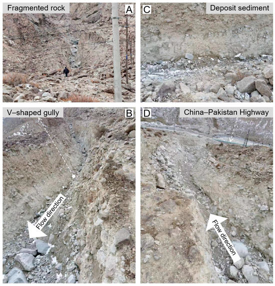 Laqi Gully features: (A) fragmented rock; (B) V-shaped gully; (C) deposit sediment; and (D) the position of the China–Pakistan Highway relative to Laqi Gully.