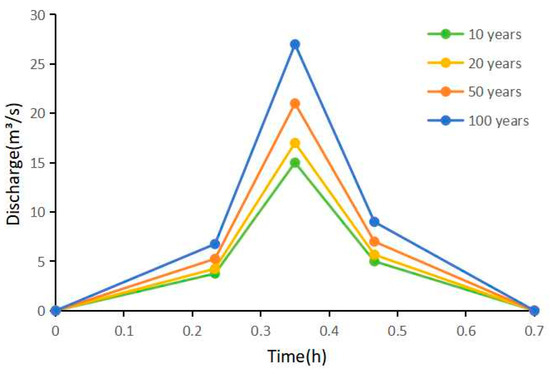 Through calculations, we obtained the peak flow rate of debris flows in Laqi Gully under four different return periods of 10 years, 20 years, 50 years, and 100 years. Then, we used the pentagonal generalization method to draw the flow process lines of debris flows under different return periods (Figure 5).