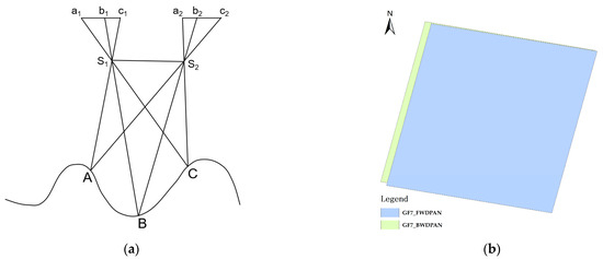 GF-7 stereo image pair features: (a) stereo image pair extraction DEM principle and (b) GF-7 stereo image pair.