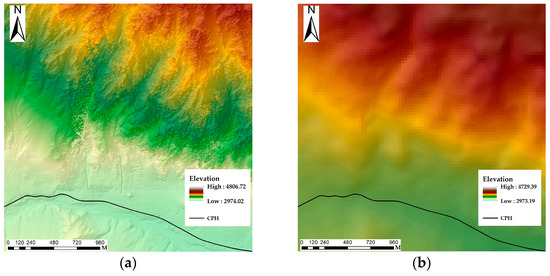 We mainly used ENVI (version 6.0) software to extract the DEM of the study area. The technical route of extracting DEM from stereo image pairs mainly includes reading front-view and back-view images, choosing whether to define control points and the number of defined control points, selecting the connection points of homonymous points in stereo image pairs, generating kernel line images, and extracting the DEM and other steps. Through these steps, we extracted a DEM covering Laqi Gully and its surrounding areas with a horizontal accuracy of 1 m. In terms of elevation data accuracy, the highest point of Laqi Gully has a measured elevation of 4795.62 m. Based on the DEM extracted from GF-7 imagery, the highest point of the watershed has an elevation of 4806.72 m, while the corresponding elevation value in the open-source DEM is 4729.39 m. The measured altitude of the roadbed of the China–Pakistan Highway in the Laqi Gully section is 2973.89 m, while the altitude of the roadbed in this section in the DEM extracted from GF-7 images is 2974.02 m, and the corresponding value in the open-source DEM is 2973.19 m. In addition, the DEM extracted from GF-7 images has a smaller grid size and a more detailed depiction of vertical geographical features. The comparison shows that the DEM extracted from GF-7 images has higher vertical resolution. In summary, the DEM extracted from GF-7 data shows significant advantages in both horizontal and vertical resolution and can accurately characterize the narrow valley terrain features of Laqi Gully. The comparison results with the open source 30 m accuracy DEM are shown in Figure 7.