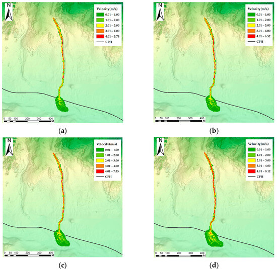 Debris flow velocity by return period: (a) 10-year; (b) 20-year; (c) 50-year; and (d) 100-year return periods.