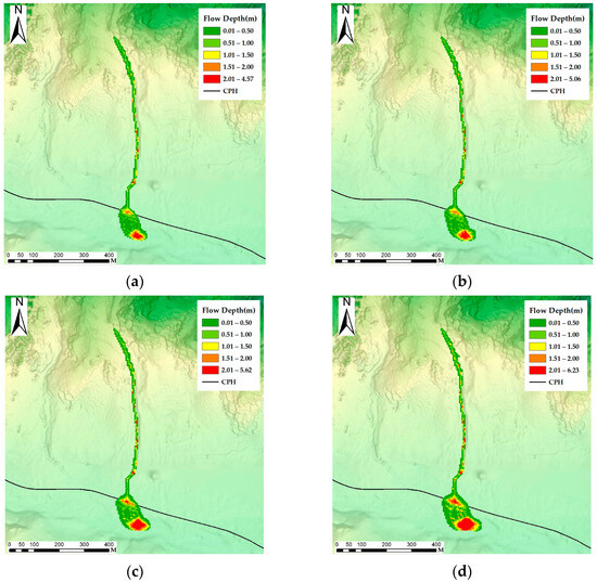 Debris flow depth by return period: (a) 10-year; (b) 20-year; (c) 50-year; and (d) 100-year return periods.