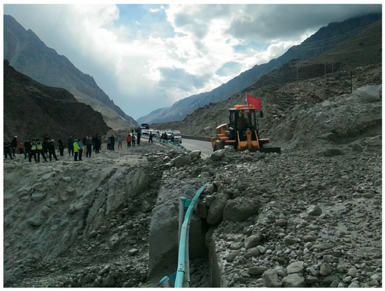 As an international corridor connecting China and Pakistan, the China–Pakistan Highway (CPH), with its Pamir Plateau section, traverses the core area of the Cenozoic orogenic belt, including the western part of the Kunlun Mountains, the Karakorum Mountains, the Hindu Kush Mountains, and the Himalayas [7]. The section is dotted with vast glaciers along the route and has complex highland alpine landforms and geological conditions [8]. Due to the difficult terrain, frequent geological activities, and special highland alpine climate, debris flows have become a frequent and destructive natural disaster along the China–Pakistan Highway [9]. Sixty-eight debris flow disasters occurred along the China section of the China–Pakistan Highway between 2020 and 2023, which accounted for 49.28% of the total number of debris flow disasters along the highway in the entire Xinjiang region [10]. Such disaster events not only damage the integrity of the roadbed structure and road facilities, but also lead to an average annual disruption of the road section of more than 160 h [10], which seriously affects the safety and smoothness of the highway.
