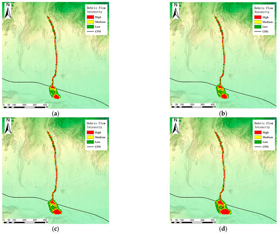 Debris flow intensity by return period: (a) 10-year; (b) 20-year; (c) 50-year; and (d) 100-year return periods.