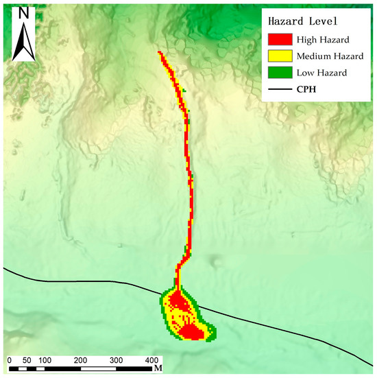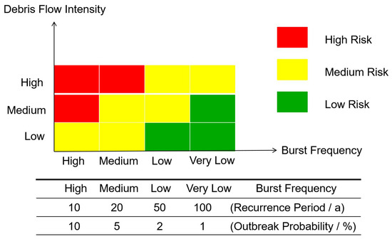Currently, the most commonly used method in the numerical simulation of debris flows is to combine the intensity of debris flows and the recurrence period of debris flows to evaluate the hazard zoning of debris flows. In this study, the hazard level of debris flow in Laqi Gully was classified as low, medium, and high by combining the intensity and recurrence period of the debris flow according to the Swiss and Austrian standards (Figure 12), and the debris flow hazard zoning map was produced accordingly.