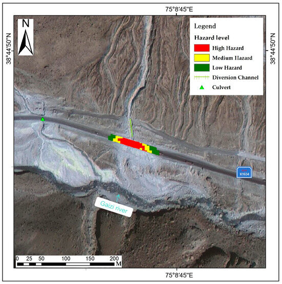 Based on this classification of danger levels, we have constructed the danger line zoning map of the section of the China–Pakistan Highway located at the alluvial fan of the Laqi Gully debris flow (Figure 14). Among them, the high-risk section is the longest, which is 58.65 m long. It is mainly located in the accumulation area at the mouth of the Laqi Gully and poses the most serious threat to the safety of pedestrians and vehicles as well as threatening road facilities. The medium- and low-risk sections are 27.36 m and 24.1 m, respectively. They are located at both ends of the high-risk section in sequence and still pose certain dangers to traffic. Therefore, when a mudslide occurs, it is very necessary to promptly prevent pedestrians and vehicles from entering the dangerous area of this section of the road.