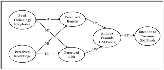 Perceived benefits refer to the positive outcomes of consumer behavior in response to an actual or perceived threat [18]. Trust in an organization or an individual critically influences perceived benefits [8]. While the industry requires innovative technologies for food development, substantial evidence suggests that many consumers are apprehensive about new foods and technologies due to perceived risks and a lack of perceived health benefits [17,19]. According to Ali et al. [8], organizational credibility, honesty, and benevolence play crucial roles in shaping consumer perceptions of the acceptance of GM foods. It is theorized that perceived risks negatively impact attitudes, whereas perceived benefits have a positive effect [13]. If GM foods provide substantial benefits, these benefits outweigh the perceived risks, leading to a positive attitude towards GM foods. Otherwise, consumer acceptance may remain very low if perceived risks outweigh the benefits [20]. When information about GM food technology is insufficient, consumers cannot objectively evaluate potential risks and benefits. In this context, the following hypotheses were developed: