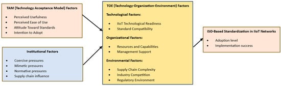 The conceptual model illustrates how the three theoretical frameworks—the TAM, Institutional Theory, and Technology Organization-Environment (TOE) Framework—collectively influence the adoption and implementation of ISO-based standardization in IIoT networks for supply chain management.