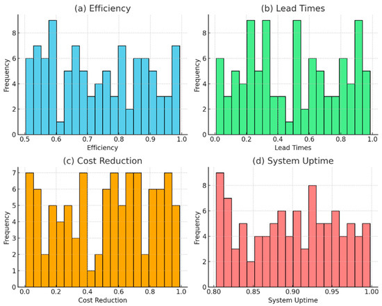 The four key performance indicators (KPIs)—efficiency, lead times, cost reduction, and system uptime—are presented in their distributions in Figure 2. The efficiency distribution reveals a uniform pattern, demonstrating that numerous companies employ best practices, resulting in high-performing firm-wide activities. The measurements for lead times focus on minimizing values, yet some organizations struggle to reduce lead time. The cost reduction data displays diverse success levels because various firms failed to achieve optimal cost-effectiveness. Most businesses demonstrate reliable system performance because system uptime concentrates on strong values. System uptime and efficiency demonstrate high levels across firms, yet companies must focus on shortening their lead times and reducing expenses.