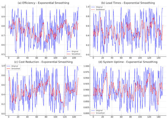 Figure 3 illustrates the results of exponential smoothing applied to the KPIs: efficiency, lead times, cost reduction, and system uptime. The original values, shown in blue, represent the raw data, while the smoothed values, depicted by the red dashed line, highlight the underlying long-term trends. For efficiency, the smoothed line remains relatively stable, indicating that most firms maintain consistent performance with only minor fluctuations over time. In contrast, lead times exhibit more significant variations in the original data; however, the smoothed line shows a slight improvement in operational speed, suggesting that some firms are reducing their lead times. Cost reduction exhibits significant fluctuations, with the smoothed trend indicating an overall improvement; however, the variability suggests inconsistency in cost optimization efforts. Lastly, system uptime remains largely stable, with minimal variation, reflecting strong and consistent system reliability across firms.