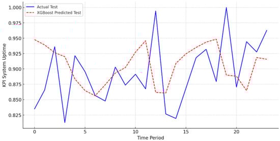 The XGBoost model in Figure 4 effectively captures the general trends and volatility in the system uptime KPI, as seen in the alignment between the predicted (red dashed line) and actual (blue line) values. The model accurately captures the fluctuations, reflecting the system uptime’s ups and downs over time. However, the predictions slightly lag during the more volatile periods, indicating that while the model captures the main patterns, some sharp peaks and troughs are not perfectly predicted. This highlights the model’s strength in trend prediction while leaving room for improvement in capturing extreme variations.